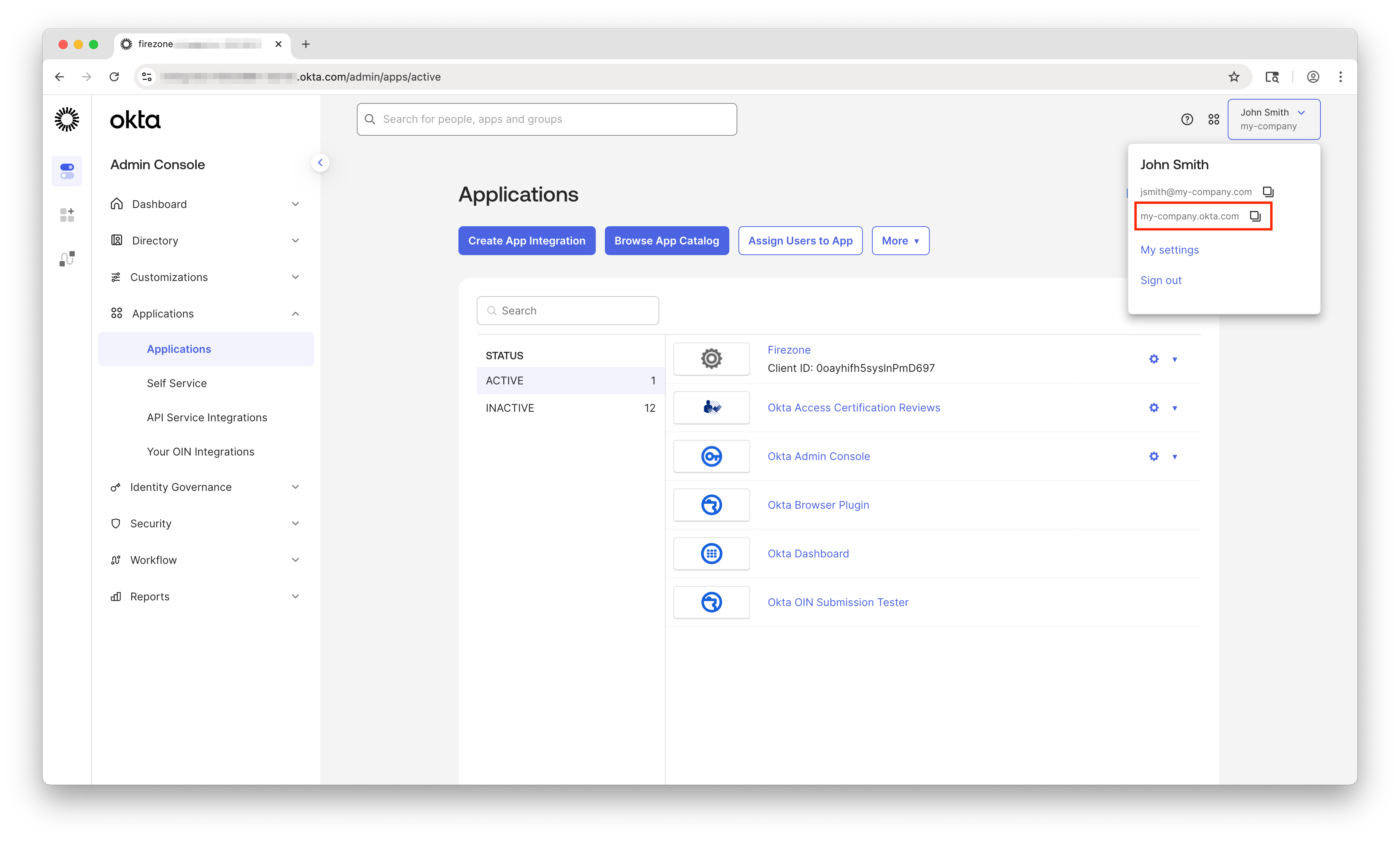 Next, copy your Okta domain from the upper right corner of your Okta dashboard (click on your username to see it) and paste it into the Okta Domain field in the Firezone setup form.
