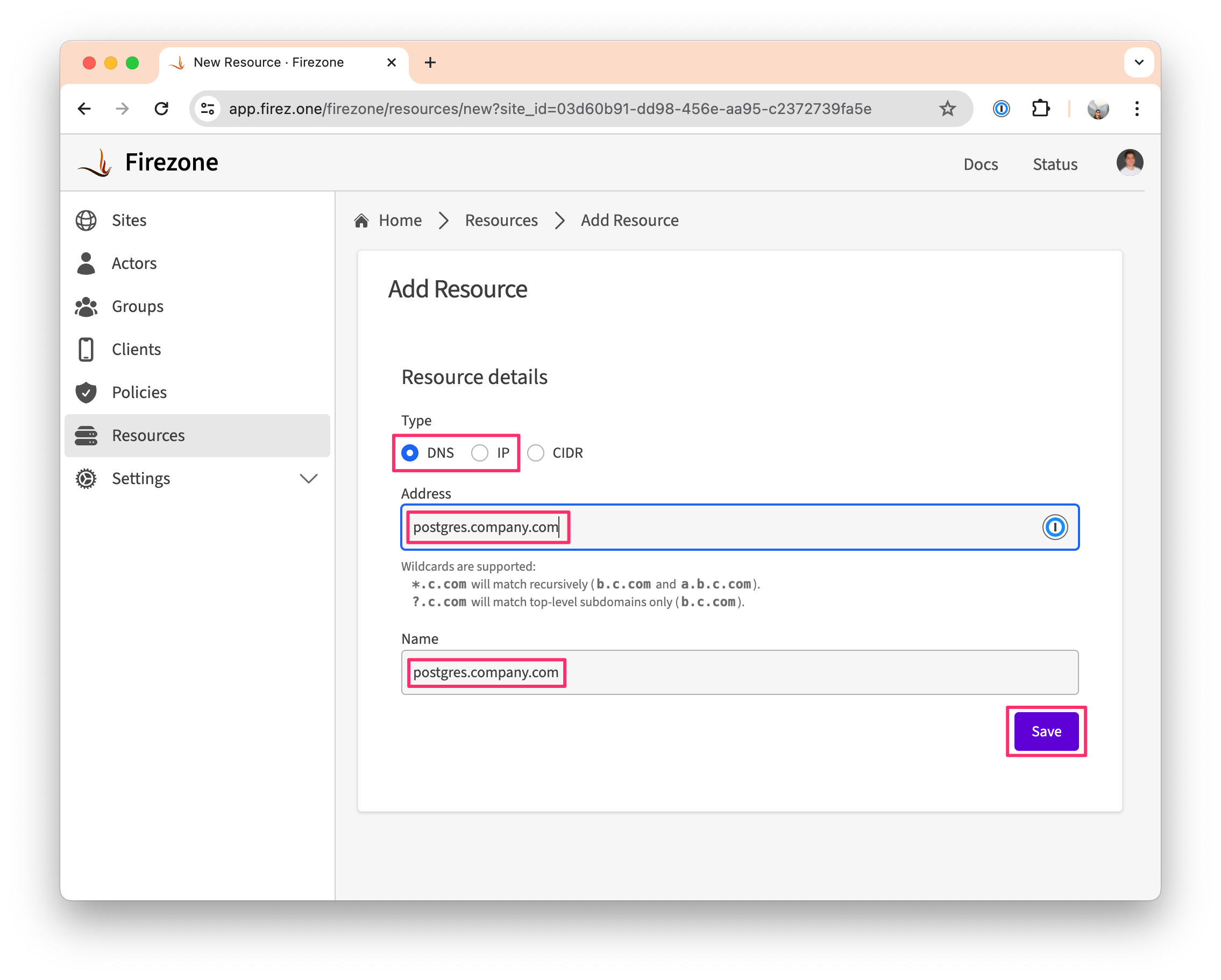 2. Select DNS or IP as the Resource type depending on how you plan to access the database. If you're using a DNS name, the address should be resolvable by all of the Gateways in your Site.